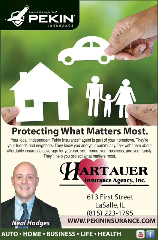 Bayond the expected PEKIN INSURANCE Protecting What Matters Most. Your local, independent Pekin Insurance agent is part of your hometown. They're your friends and neighbors. They know you and your community. Talk with them about affordable insurance coverage tor your car, your home, your business, and your family. They'll help you protect what matters most. HARTAUER Insurance Agency, Inc. 613 First Street LaSalle, IL (815) 223-1795 www.PEKININSURANCE.COM Neal Hodges AUTO HOME BUSINESS LIFE HEALTH f You Bayond the expected PEKIN INSURANCE Protecting What Matters Most. Your local, independent Pekin Insurance agent is part of your hometown. They're your friends and neighbors. They know you and your community. Talk with them about affordable insurance coverage tor your car, your home, your business, and your family. They'll help you protect what matters most. HARTAUER Insurance Agency, Inc. 613 First Street LaSalle, IL (815) 223-1795 www.PEKININSURANCE.COM Neal Hodges AUTO HOME BUSINESS LIFE HEALTH f You
