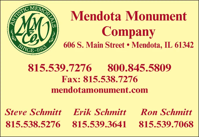 EMORIALS Mendota Monument M00 Company 606 S. Main Street Mendota, IL 61342 SINCE-1913 815.539.7276 800.845.5809 Fax: 815.538.7276 mendotamonument.com Ron Schmitt Steve Schmitt Erik Schmitt 815.539.3641 815.539.7068 815.538.5276 SM-LA1763013 ARTISTIC EMORIALS Mendota Monument M00 Company 606 S. Main Street Mendota, IL 61342 SINCE-1913 815.539.7276 800.845.5809 Fax: 815.538.7276 mendotamonument.com Ron Schmitt Steve Schmitt Erik Schmitt 815.539.3641 815.539.7068 815.538.5276 SM-LA1763013 ARTISTIC