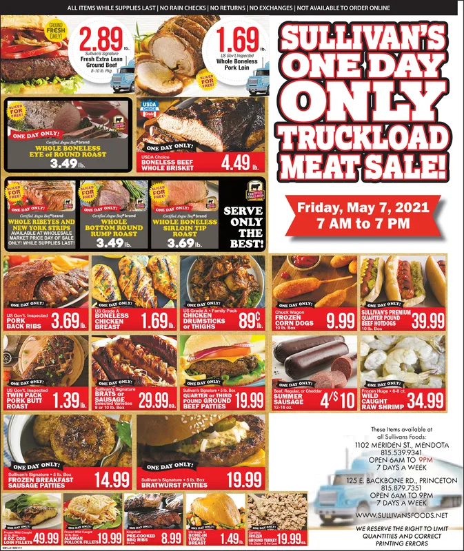 ALL ITEMS WHILE SUPPLIES LAST | NO RAIN CHECKS | NO RETURNS | NO EXCHANGES | NOT AVAILABLE TO ORDER ONLINE 1.69. SULLIVAN'S ONE DAY OOUNO FRESH DAILY 2.89 Sulivans Signatre Fresh Extra Lean Ground Beef 8-10 . Po LS Govt inspected Whole Boneless Pork Loin SICED FOR FREE ONLY TRUCKLOAD 4.49. MEAT SALE! USDA FOR FREEL ONE DAY ONLY! Ceiad dagu brand WHOLE BONELESS EYE of ROUND ROAST 3.49 Ib. ONE DAY ONLY! USDA Cholce BONELESS BEEF WHOLE BRISKET FOR FREET ICED FOR FREE FOR FREE Friday, May 7, 2021 7 AM to 7 PM ONE DAY ONLY Cefl dg Bbrand WHOLE RIBEYES AND ONE BAY ONLY Cefad gu brand WHOLE BOTTOM ROUND RUMP ROAST ONE DAY ONLY Ceel dg Bbrand WHOLE BONELESS SIRLOIN TIP ROAST SERVE ONLY THE BEST! NEW YORK STRIPS AVAILABLE AT WHOLESALE MARKET PRICE DAY OF SALE ONLY! WHILE SUPPLIES LASTI 3.49 b. 3.69 Ib. ONE BAY ONLY US Orpde A BONELESS CHICKEN Ib. BREAST ONE BAY ONLY US Grade A Family Pack CHICKEN DRUMSTICKS or THIGHS ONE DAY ONLY Chuck Wagon FROZEN CORN DOGS 10 ib. Box ONE BAT ONLY ONE DAY ONLY US Govt Inspected PORK BACK RIBS 3.69 1.69. 89 9.99 SULLIVAN'S PREMIUM QUARTER POUND BEEF HOTDOGS 10. Box 39.99 ONE BAT ONLY US Govt Inspected TWIN PACK PORK BUTT ONE BAY ONLY Sulivan's Signature BRATS or SAUSAGE 29.99. ONE DAY ONLY Sulivan's Signature5 b. Bex QUARTER or THIRD POUND GROUND BEEF PATTIES ONE DAY ONLY Beef, Regular, or Cheddar SUMMER SAUSAGE 4/$ 10 RAW SHRIMP 34.99 ONE DAY ONLY Frozen Huge 6-8 et. WILD CAUGHT 1.39. 19.99 Selected Varisties 9 or 10 Ib. Box ROAST 12-16 oz. These Items available at all Sullivans foods: 1102 MERIDEN ST., MENDOTA 815.539.9341 OPEN 6AM TO 9PM 7 DAYS A WEEK ONE DAY ONLY! Sulivan's Signature 5 Ib. Box FROZEN BREAKFAST ONE DAY ONLY! 14.99 19.99 125 E. BACKBONE RD, PRINCETON 815.879.7351 OPEN 6AM TO 9PM 7 DAYS A WEEK Sulivan's Signature5 ib. Box BRATWURST PATTIES SAUSAGE PATTIES www.SULLIVANSFOODS.NET WE RESERVE THE RIGHT TO LIMIT QUANTITIES AND CORRECT rw Ce Kguto PRE-COOKED BBQ RIBS 8.99 BONE-IN TURKEY BREAST 1.49. Cetna FROZEN 19.99 8OZ COD ALASKAN LoN FLET 49.99 PRINTING ERRORS ALL ITEMS WHILE SUPPLIES LAST | NO RAIN CHECKS | NO RETURNS | NO EXCHANGES | NOT AVAILABLE TO ORDER ONLINE 1.69. SULLIVAN'S ONE DAY OOUNO FRESH DAILY 2.89 Sulivans Signatre Fresh Extra Lean Ground Beef 8-10 . Po LS Govt inspected Whole Boneless Pork Loin SICED FOR FREE ONLY TRUCKLOAD 4.49. MEAT SALE! USDA FOR FREEL ONE DAY ONLY! Ceiad dagu brand WHOLE BONELESS EYE of ROUND ROAST 3.49 Ib. ONE DAY ONLY! USDA Cholce BONELESS BEEF WHOLE BRISKET FOR FREET ICED FOR FREE FOR FREE Friday, May 7, 2021 7 AM to 7 PM ONE DAY ONLY Cefl dg Bbrand WHOLE RIBEYES AND ONE BAY ONLY Cefad gu brand WHOLE BOTTOM ROUND RUMP ROAST ONE DAY ONLY Ceel dg Bbrand WHOLE BONELESS SIRLOIN TIP ROAST SERVE ONLY THE BEST! NEW YORK STRIPS AVAILABLE AT WHOLESALE MARKET PRICE DAY OF SALE ONLY! WHILE SUPPLIES LASTI 3.49 b. 3.69 Ib. ONE BAY ONLY US Orpde A BONELESS CHICKEN Ib. BREAST ONE BAY ONLY US Grade A Family Pack CHICKEN DRUMSTICKS or THIGHS ONE DAY ONLY Chuck Wagon FROZEN CORN DOGS 10 ib. Box ONE BAT ONLY ONE DAY ONLY US Govt Inspected PORK BACK RIBS 3.69 1.69. 89 9.99 SULLIVAN'S PREMIUM QUARTER POUND BEEF HOTDOGS 10. Box 39.99 ONE BAT ONLY US Govt Inspected TWIN PACK PORK BUTT ONE BAY ONLY Sulivan's Signature BRATS or SAUSAGE 29.99. ONE DAY ONLY Sulivan's Signature5 b. Bex QUARTER or THIRD POUND GROUND BEEF PATTIES ONE DAY ONLY Beef, Regular, or Cheddar SUMMER SAUSAGE 4/$ 10 RAW SHRIMP 34.99 ONE DAY ONLY Frozen Huge 6-8 et. WILD CAUGHT 1.39. 19.99 Selected Varisties 9 or 10 Ib. Box ROAST 12-16 oz. These Items available at all Sullivans foods: 1102 MERIDEN ST., MENDOTA 815.539.9341 OPEN 6AM TO 9PM 7 DAYS A WEEK ONE DAY ONLY! Sulivan's Signature 5 Ib. Box FROZEN BREAKFAST ONE DAY ONLY! 14.99 19.99 125 E. BACKBONE RD, PRINCETON 815.879.7351 OPEN 6AM TO 9PM 7 DAYS A WEEK Sulivan's Signature5 ib. Box BRATWURST PATTIES SAUSAGE PATTIES www.SULLIVANSFOODS.NET WE RESERVE THE RIGHT TO LIMIT QUANTITIES AND CORRECT rw Ce Kguto PRE-COOKED BBQ RIBS 8.99 BONE-IN TURKEY BREAST 1.49. Cetna FROZEN 19.99 8OZ COD ALASKAN LoN FLET 49.99 PRINTING ERRORS